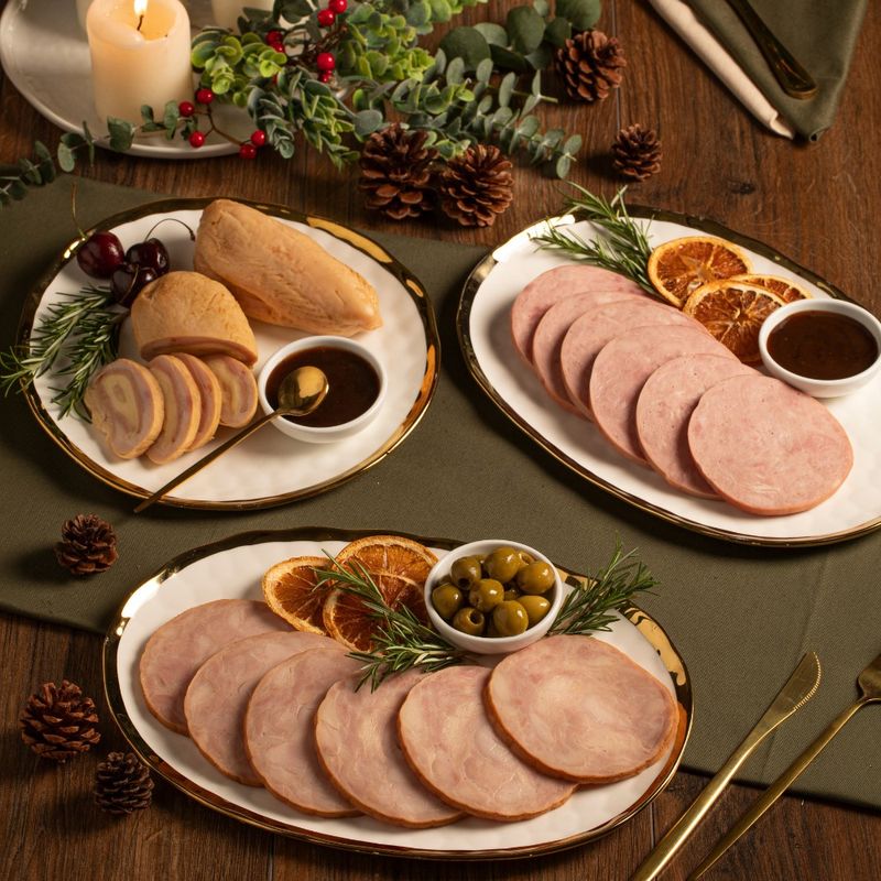 Deliciosa combinación de carnes de cerdo y pollo: 6 tajadas de rollo de pollo, 6 tajadas de jamón de cerdo ahumado, 2 pechugas rellenas.